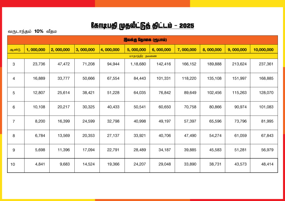 • இத்திட்டம் 1,000,000 மற்றும் 10,000,000 ரூபா முதிர்வுப் பெறுமதியினை அடையும்விதமாக  வடிவமைக்கப்பட்டுள்ளது.